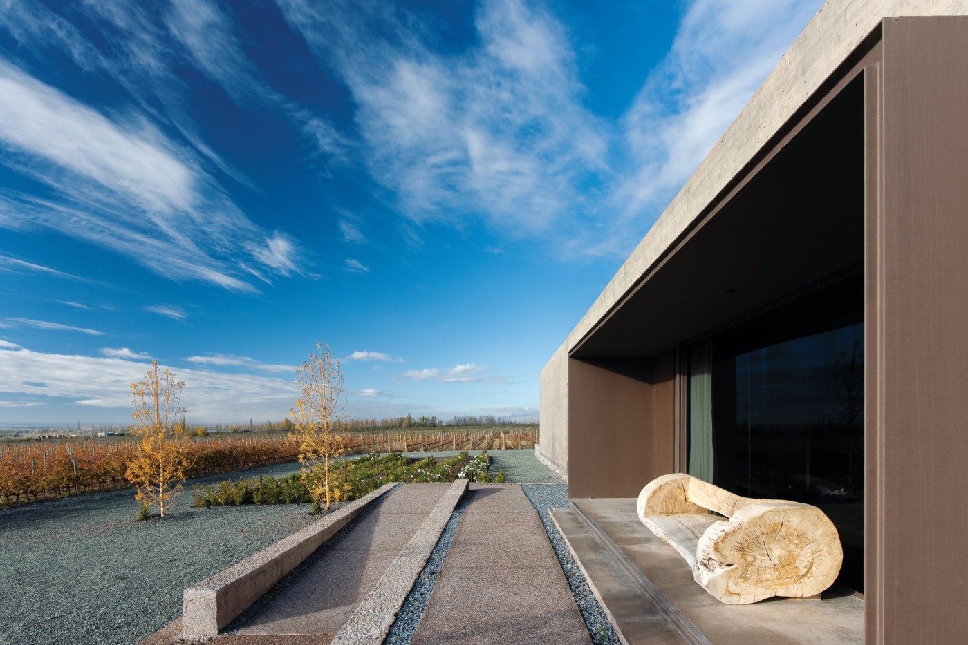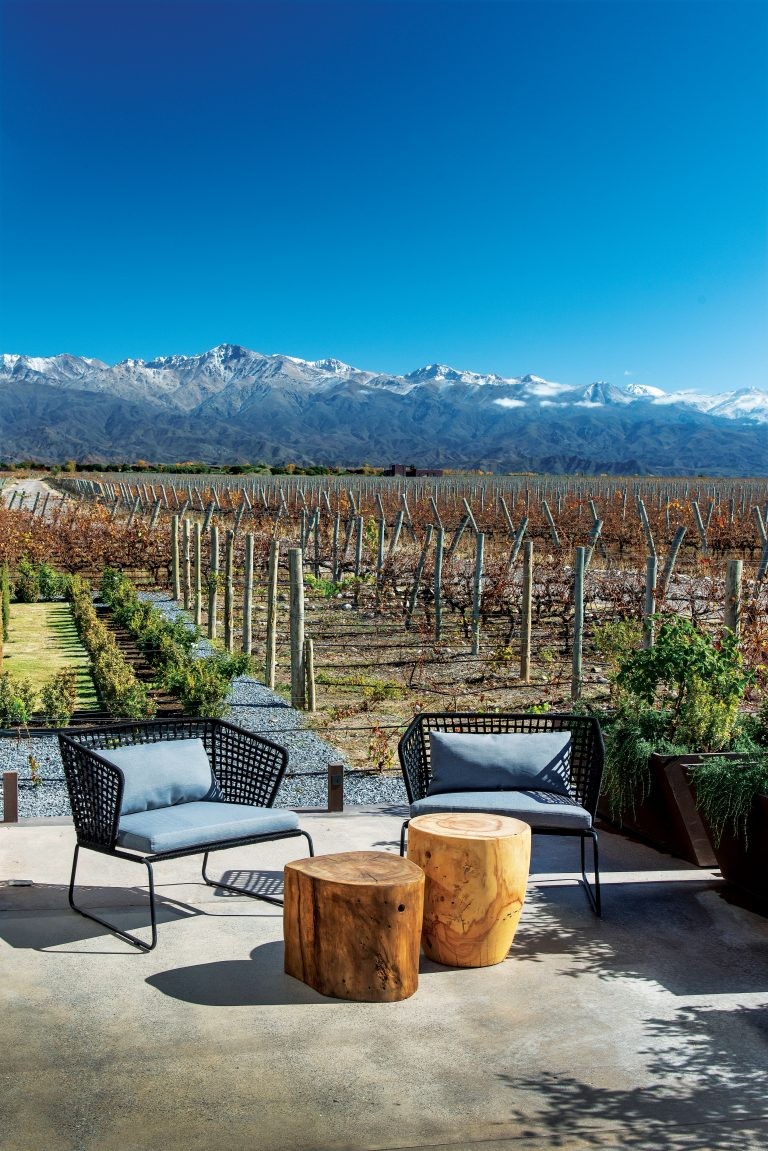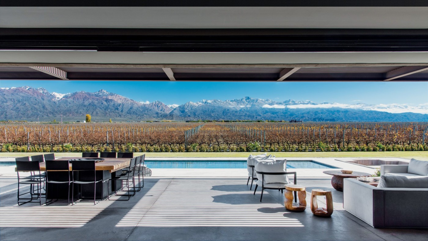 1. La galería en voladizo desde la que se puede contemplar el horizonte mendocino: la Cordillera y la vid crearon el marco del diseño. “Durante la década de 1990, Los Chacayes vio la llegada de proyectos que enriquecieron el entorno natural con viñedos que se extienden a los pies de los Andes”, señala González Olsina. Mesa y sillas de la galería realizadas en madera y chapa (Pablo Comadrán). El sillón es de Mike Outdoor Living. La mesa de centro también es un diseño de Comadrán, y las poltronas Gogo y mesas auxiliares son piezas de Quintana Casa.