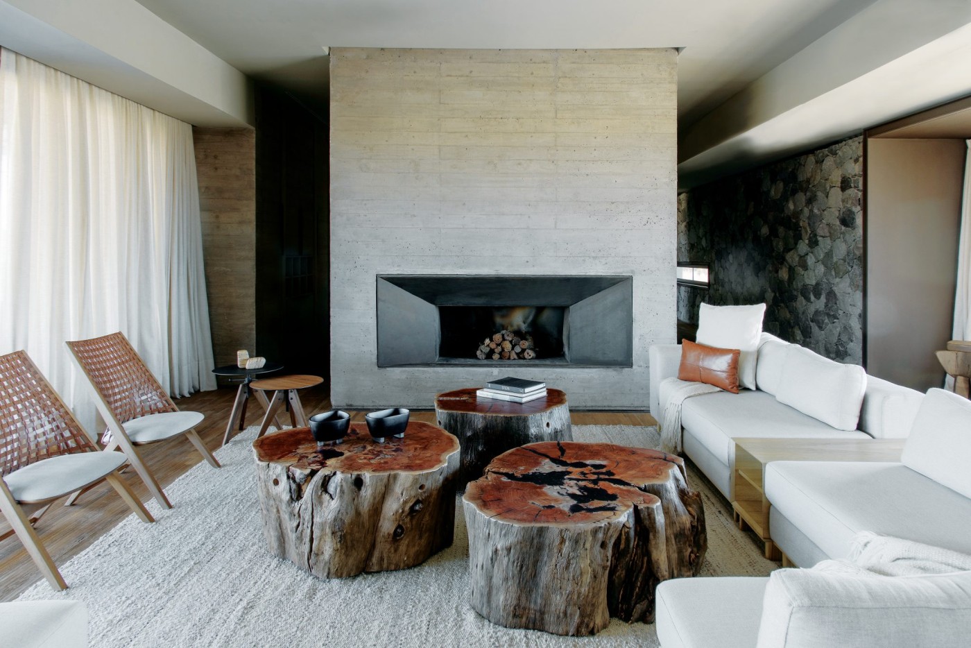 4. Sofá modular Szava en lino con intervenciones en cuero, mesas auxiliares Bowen y poltronas Saku de cuero (Quintana Casa). Mesas de centro (Pablo Comadrán). Los objetos de diseño sobre la mesa son de Quintana Casa y Vivant la vie. La alfombra del living es de Awanay y las cortinas de lino de Fernanda de Sierra. “Trabajamos para que el interiorismo genere una danza visual que acompañe el estilismo del entorno del Valle de Uco”, comparten los diseñadores.