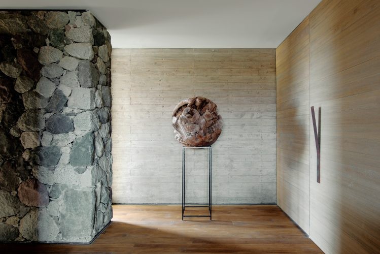 5. Piedra, hormigón y madera como hilos conductores de esta vivienda. Silla de cuero y escritorio (Quintana Casa). Los artefactos de iluminación son un diseño de Aspen Lumière. Piezas decorativas de la repisa (Quintana Casa, Vivant la vie). Escultura central de madera (Pablo Comadrán).