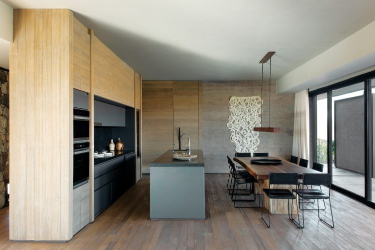6. La cocina es integrada, contemporánea y minimalista. Mesa (Pablo Comadrán). Sillas de cuero (Quintana Casa). Lámpara (Bendita tu luz). Obra realizada en fieltro hecho a mano, con texturas de hebras de pura lana virgen (Quintana Casa, con curaduría de Vicky Peláez Arte). Cortinas (Fernanda de Sierra). Accesorios de cocina (Wolf).