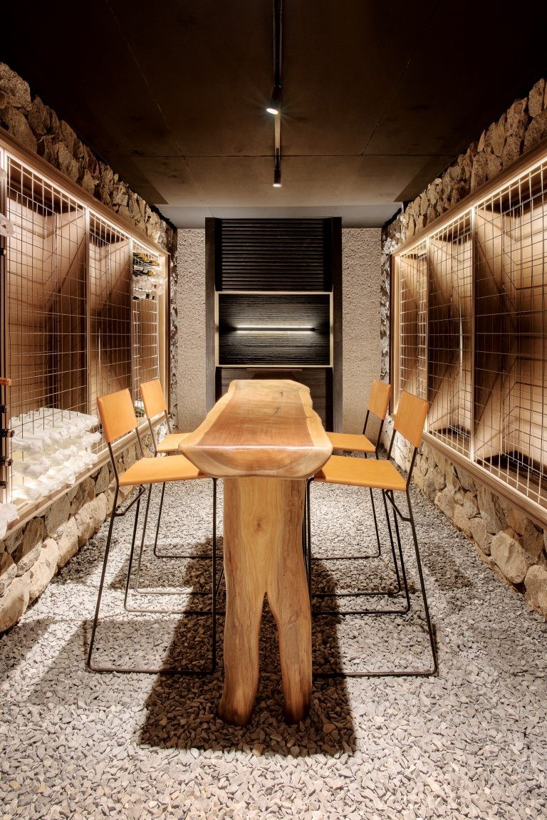 3. Banco escultura de madera maciza (Federico Arcidiácono). “La consigna primaria fue generar una comunión con el paisaje donde la arquitectura y el diseño sean uno con el entorno”, dice Consuelo Delgado. Para este proyecto se eligieron materialidades que completan un diálogo con la naturaleza.