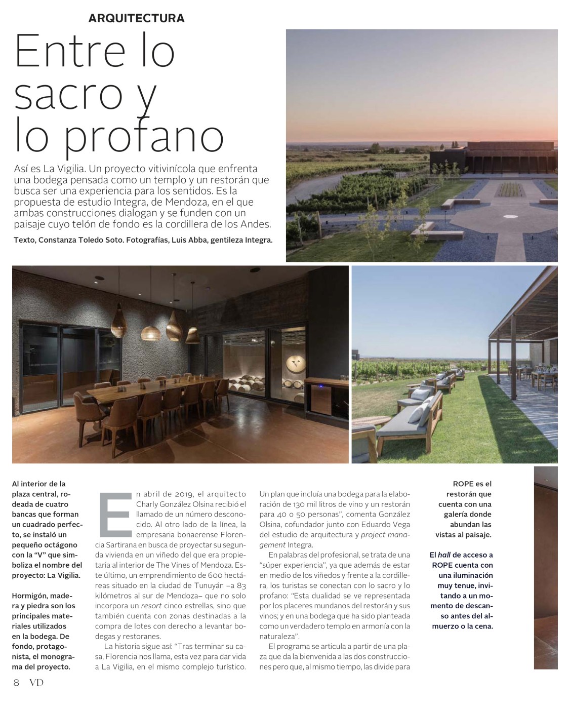 La historia sigue así: “Tras terminar su casa, Florencia nos llama, esta vez para dar vida a La Vigilia, en el mismo complejo turístico. Un plan que incluía una bodega para la elaboración de 130 mil litros de vino y un restorán para 40 o 50 personas”, comenta González Olsina, cofundador junto con Eduardo Vega del estudio de arquitectura y project management Integra.