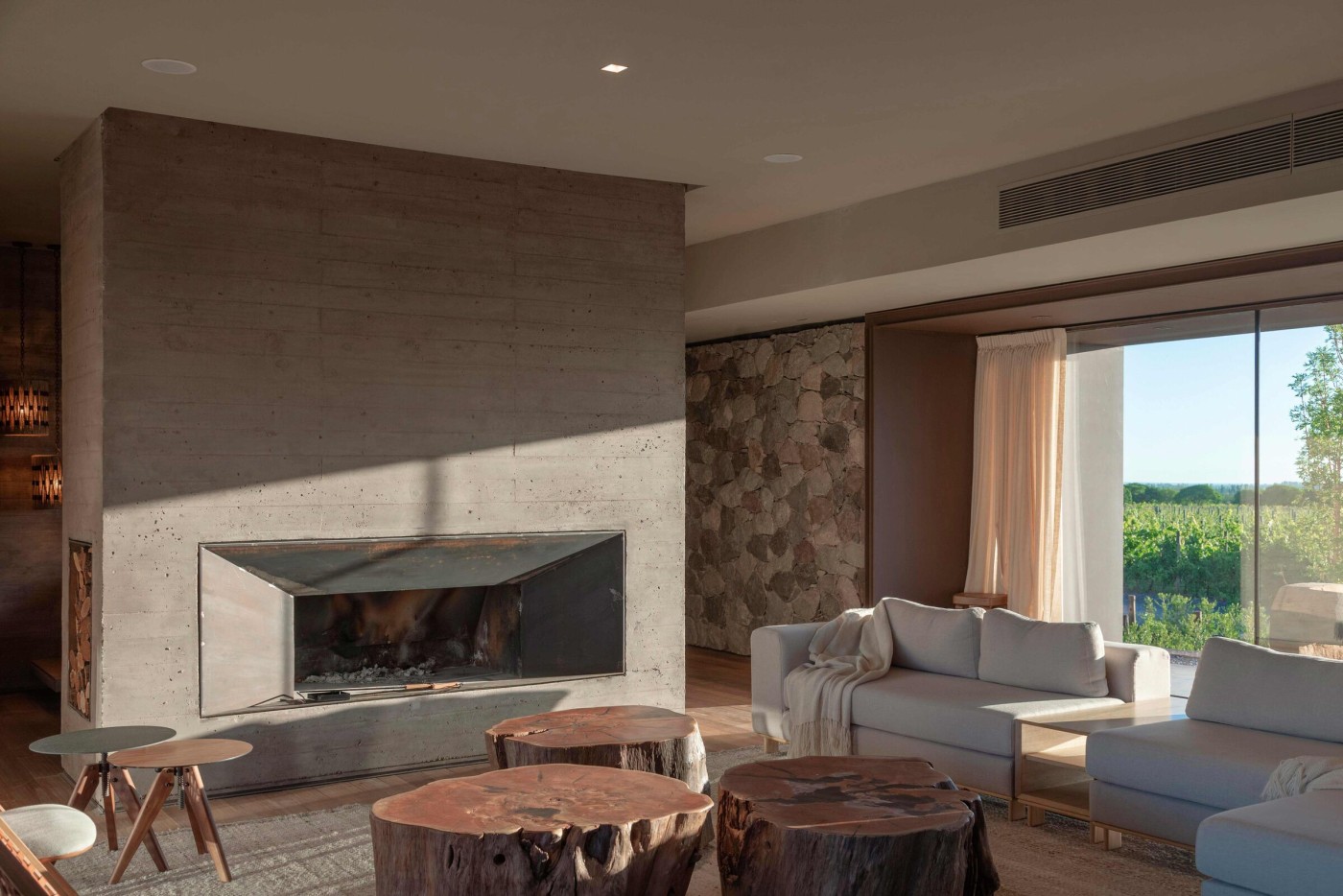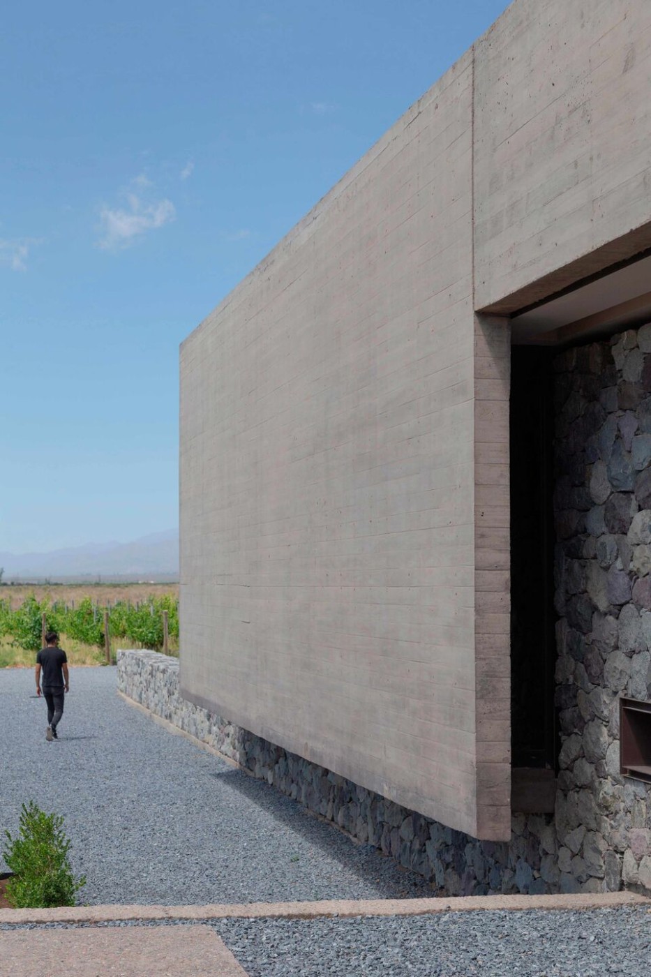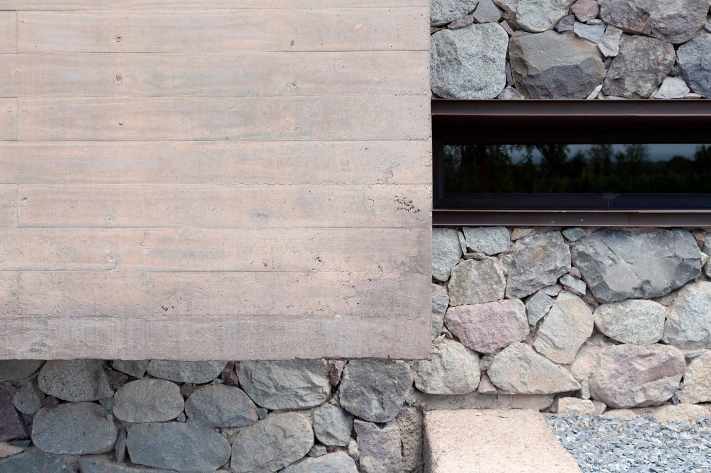 3. La materia como continuidad del entorno, donde la piedra del lugar y el hormigón pigmentado son expresiones de una misma naturaleza mineral. Masa, textura y tono se funden en una continuidad material con la cordillera. El hormigón, de presencia serena y mineral, otorga peso y atemporalidad. La piedra, en su irregularidad y densidad, ancla la obra al sitio.