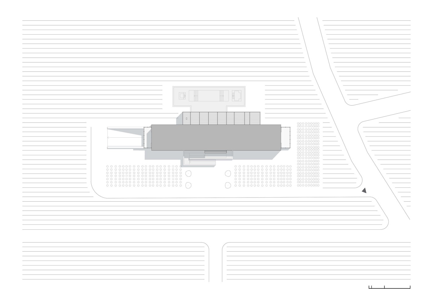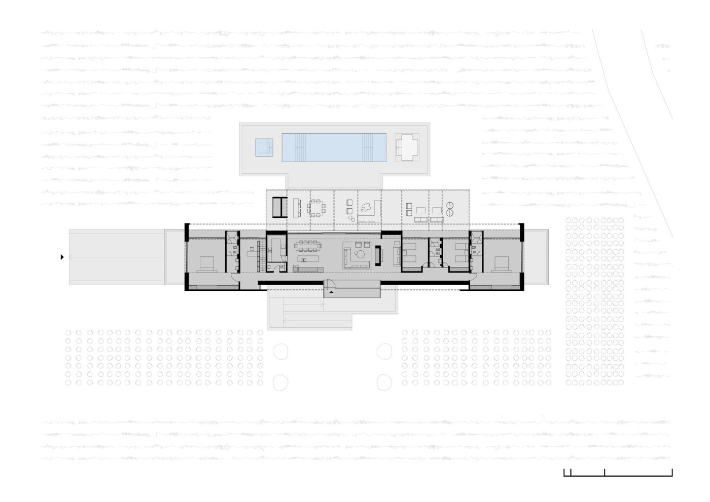 1. La horizontalidad como forma de integración, entendida tanto como gesto compositivo como actitud frente al paisaje. Mediante una circulación lineal al este, las funciones se articulan y se disponen hacia el oeste cordillerano.
