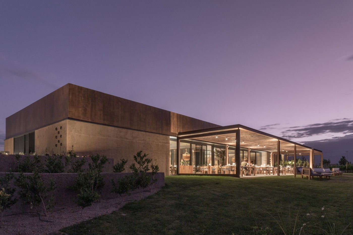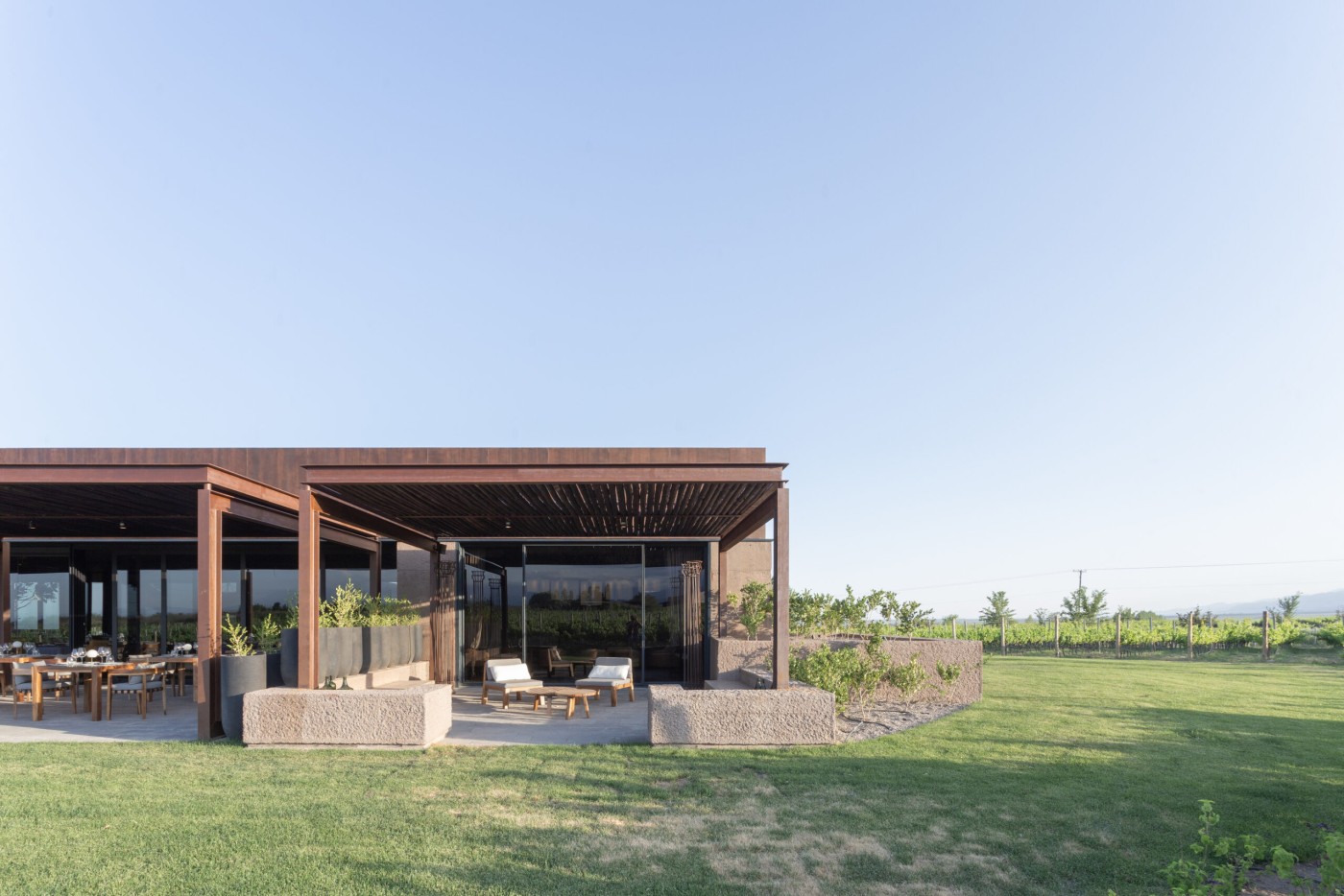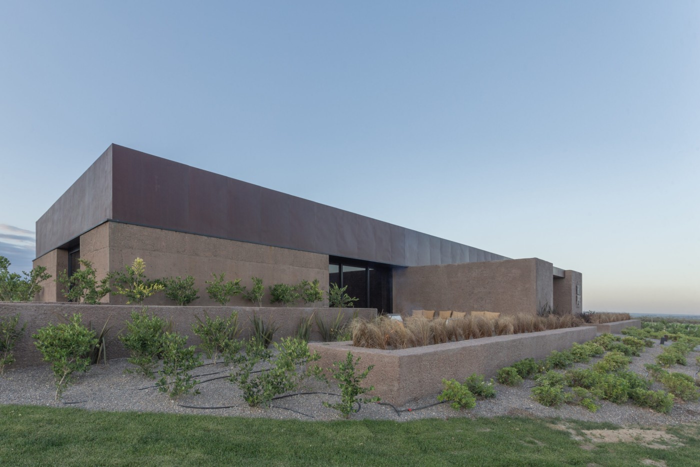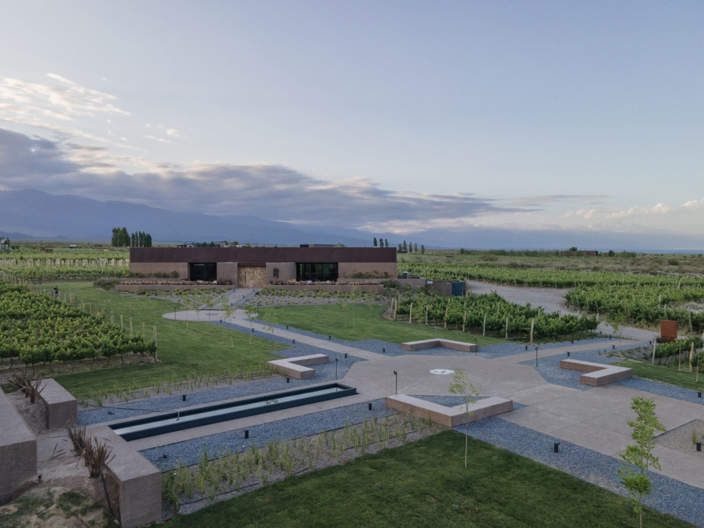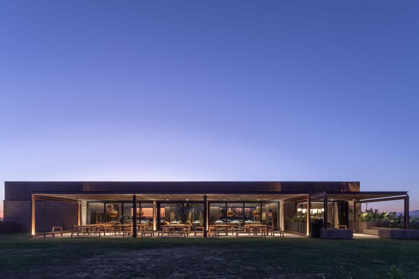 La arquitectura del lugar se resuelve en un solo nivel, con una volumetría horizontal contenida que dialoga en equilibrio con la vastedad del entorno, y enmarca de manera precisa la cordillera de los Andes como fondo escénico natural.