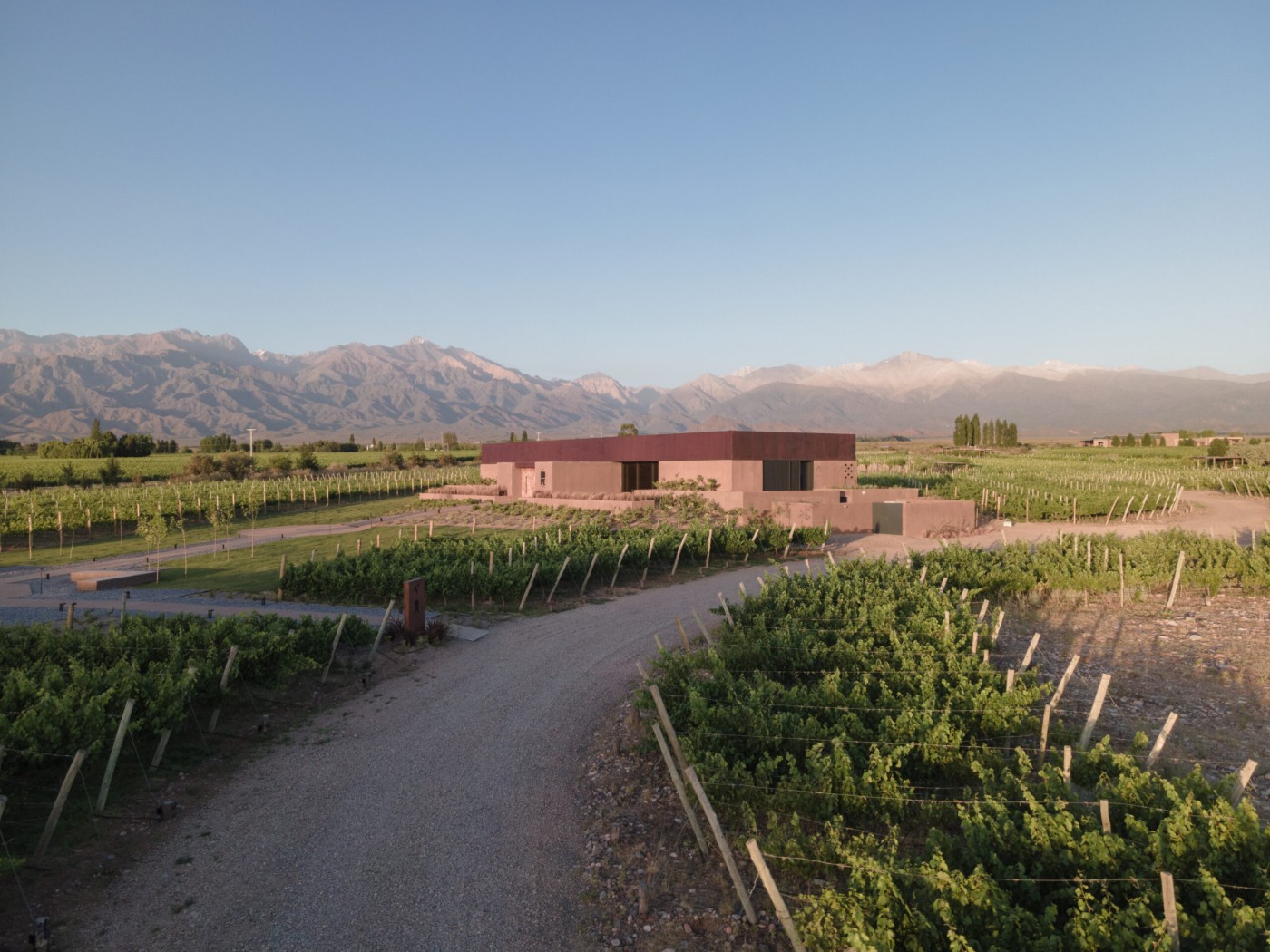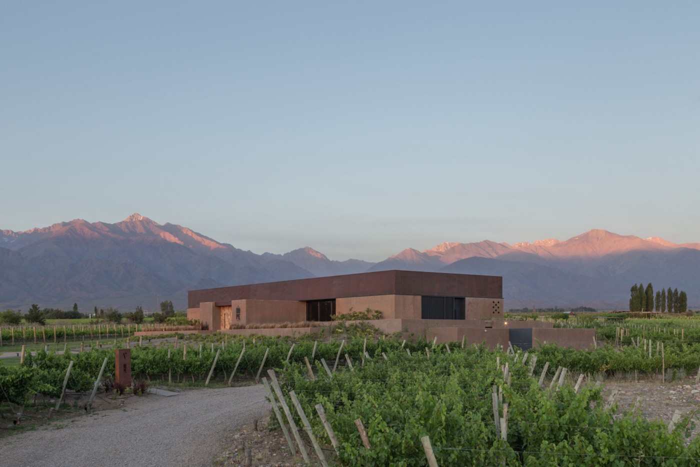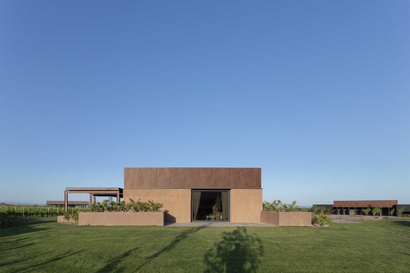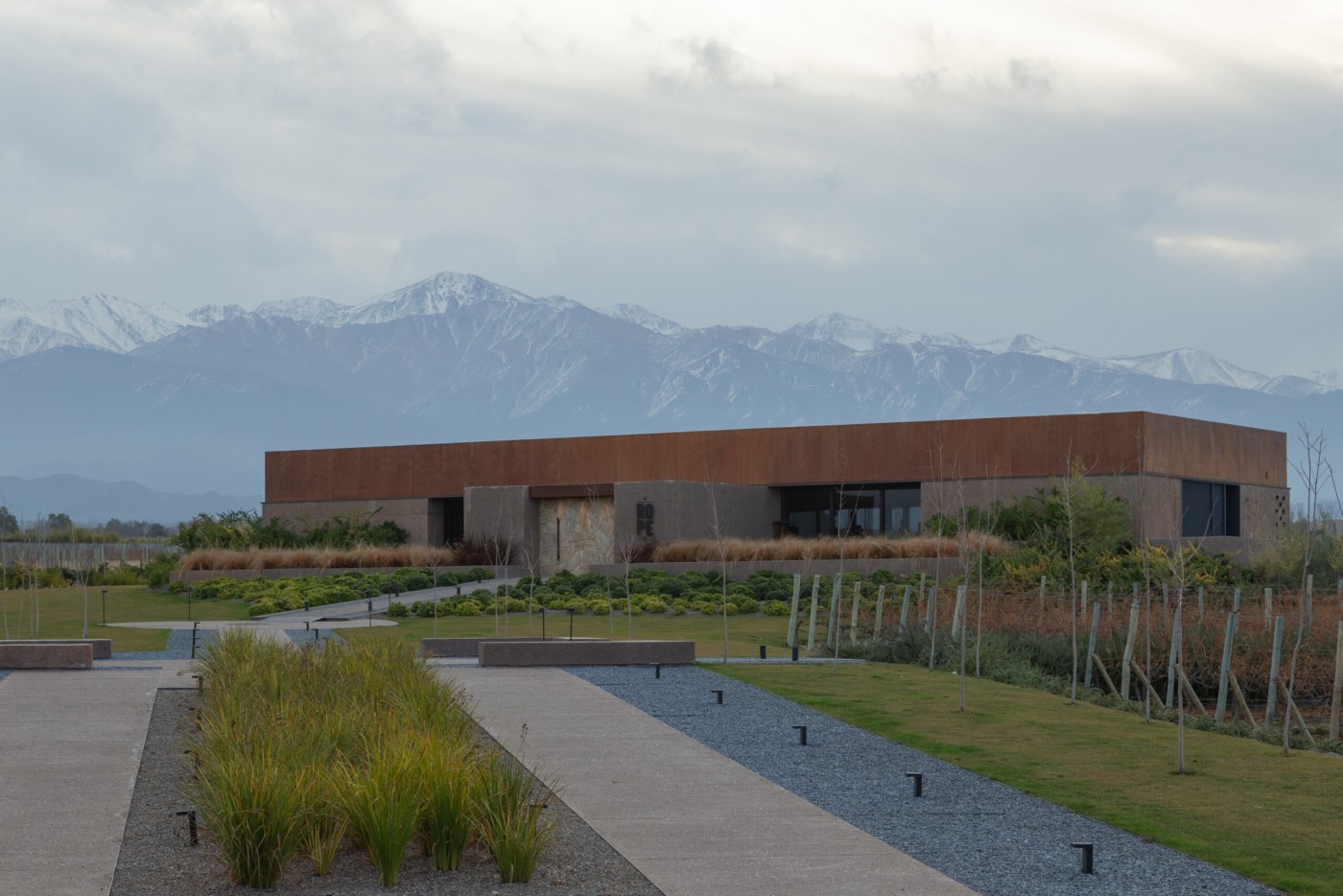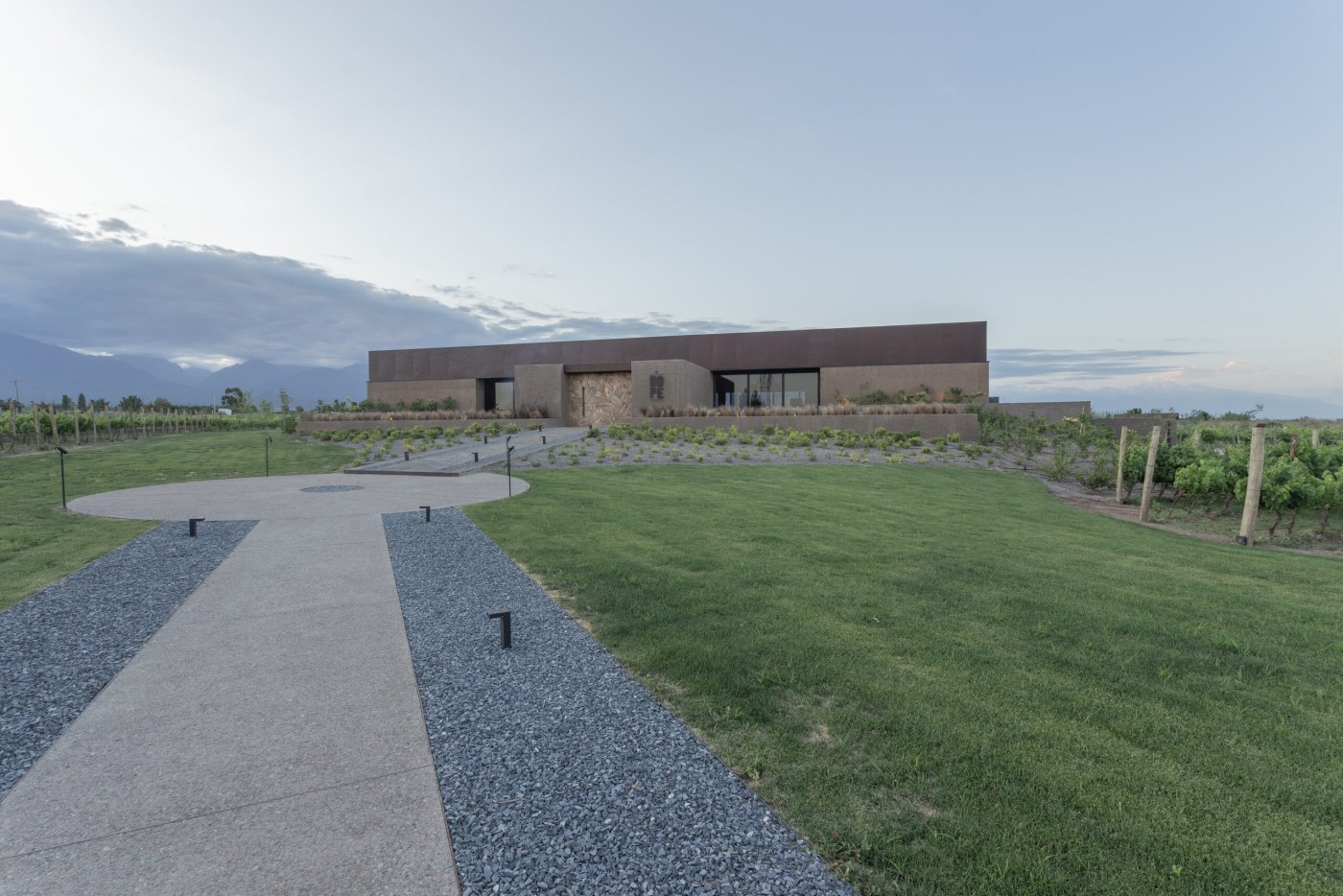 La arquitectura del lugar se resuelve en un solo nivel, con una volumetría horizontal contenida que dialoga en equilibrio con la vastedad del entorno, y enmarca de manera precisa la cordillera de los Andes como fondo escénico natural.