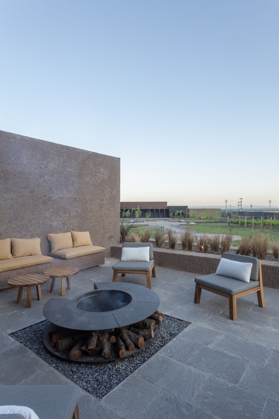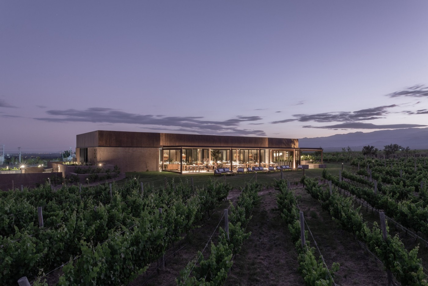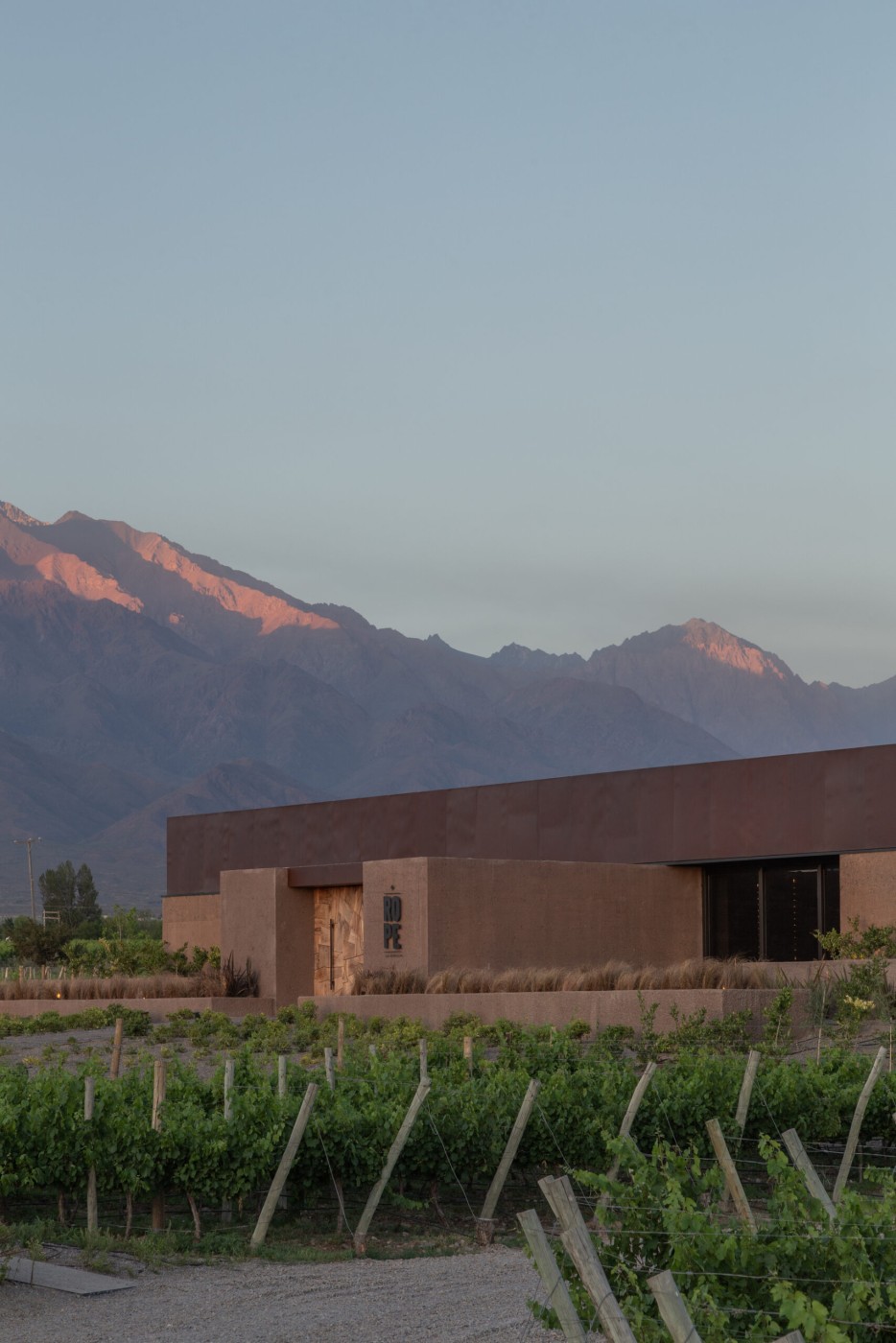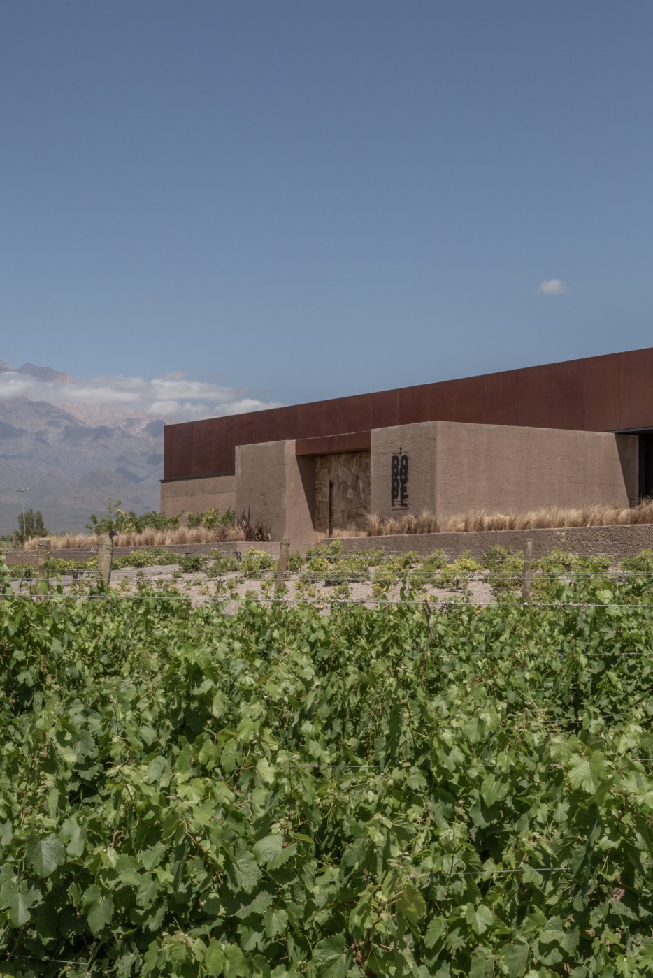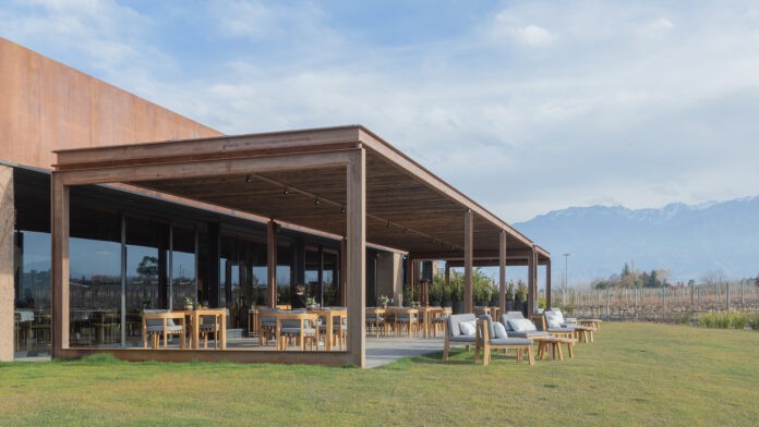 La arquitectura del lugar se resuelve en un solo nivel, con una volumetría horizontal contenida que dialoga en equilibrio con la vastedad del entorno, y enmarca de manera precisa la cordillera de los Andes como fondo escénico natural.