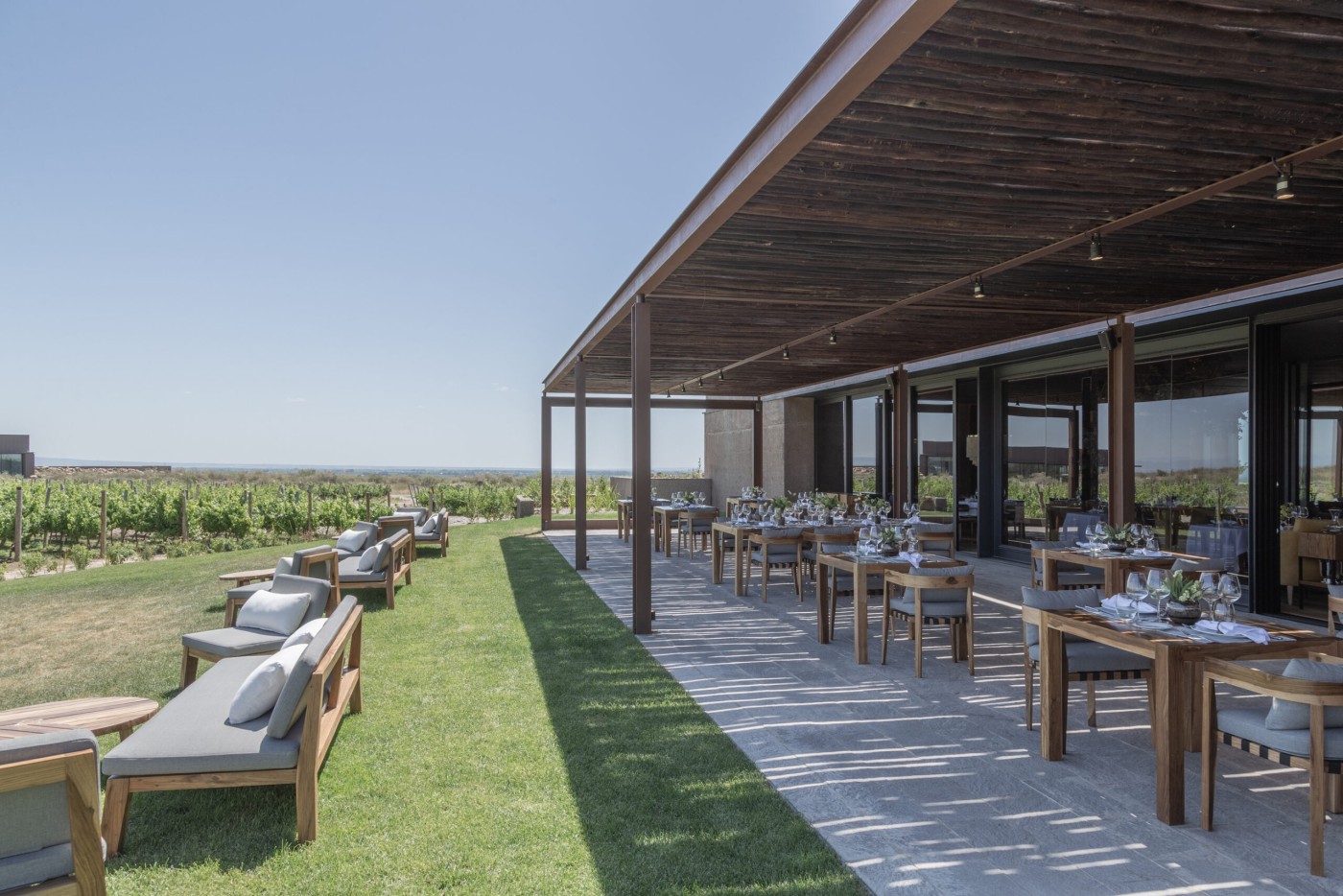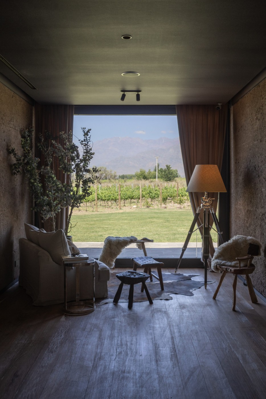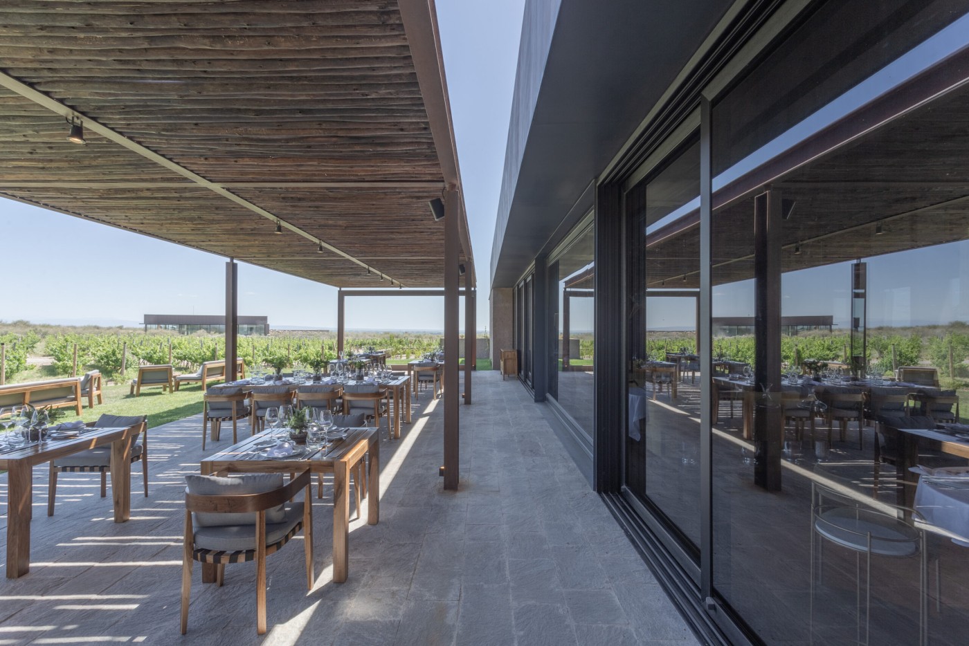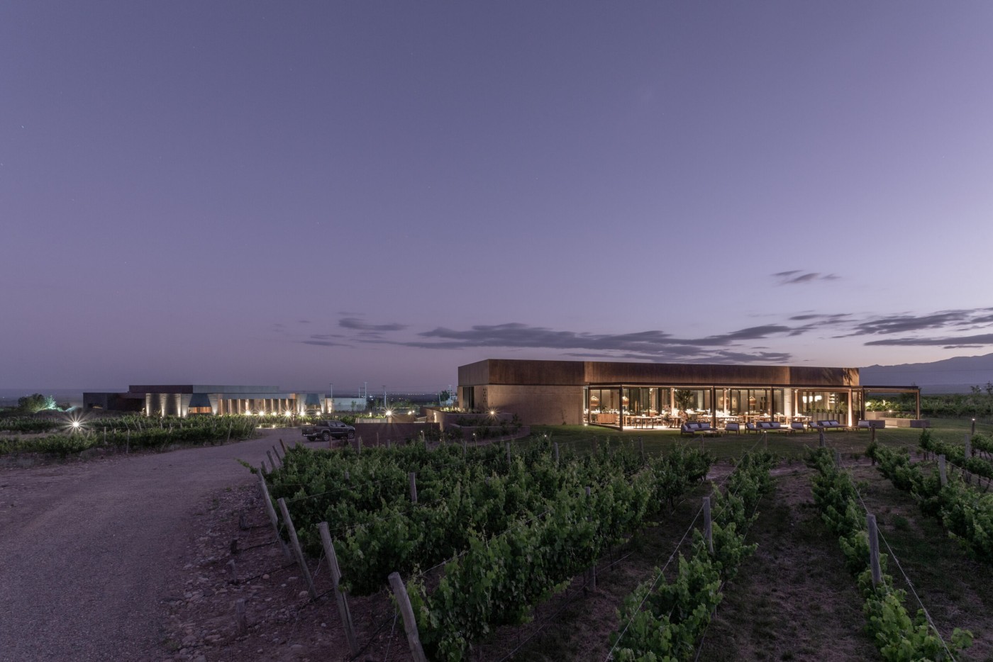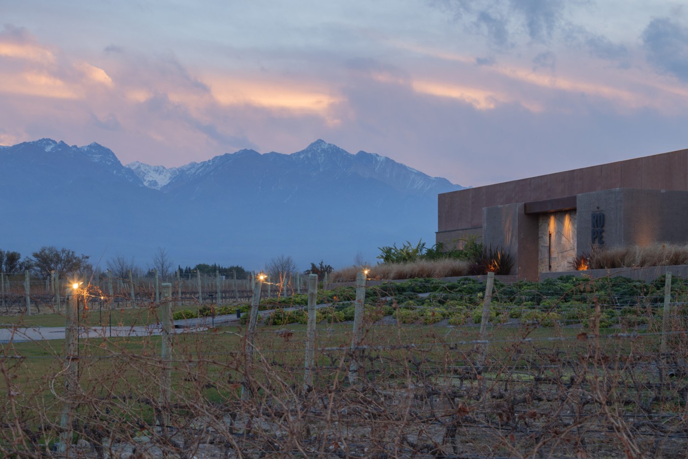 La arquitectura del lugar se resuelve en un solo nivel, con una volumetría horizontal contenida que dialoga en equilibrio con la vastedad del entorno, y enmarca de manera precisa la cordillera de los Andes como fondo escénico natural.