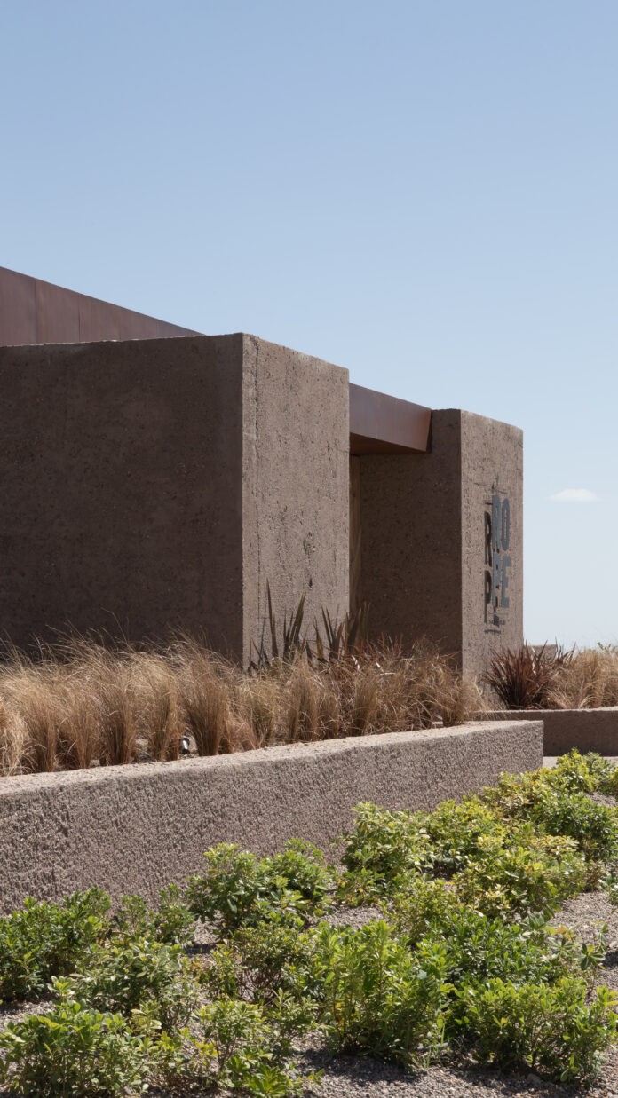l uso de hormigones hidrolavados pigmentados en color tierra, y de acero corten (oxidado, mate, telúrico) permite además que el edificio emerja como una pieza mineral, casi orgánica.