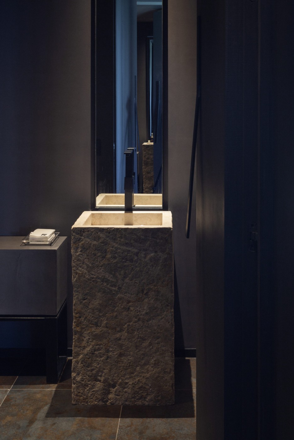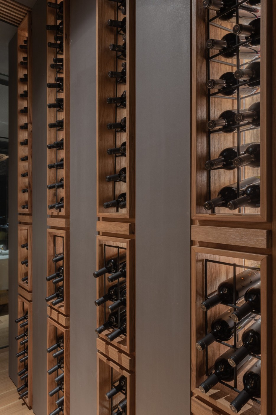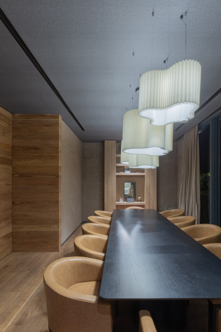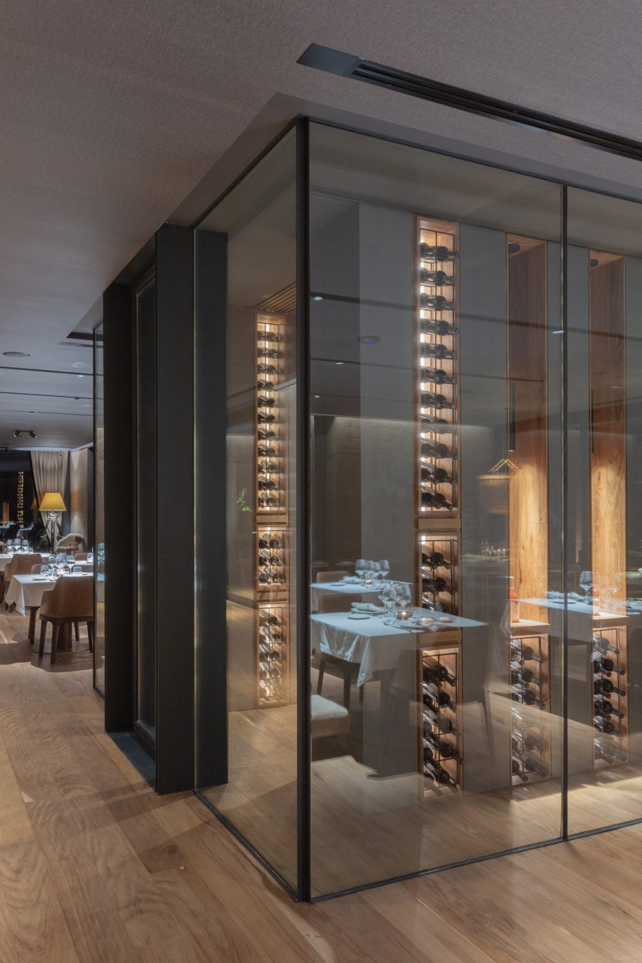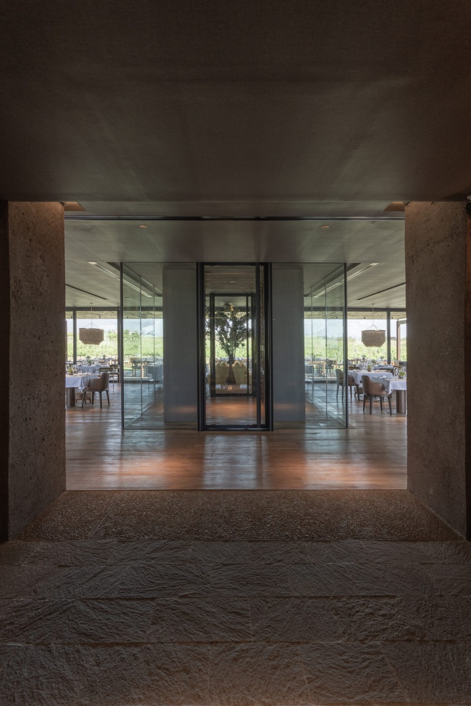 Un plan cuyo programa está destinado a sesenta comensales, y cuyo espacio interior continúa el gesto sereno de la arquitectura, con una paleta austera y cálida a la vez. Esto se logra mediante hormigones a la vista, maderas naturales y textiles nobles.